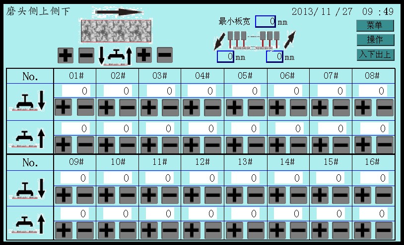 ? ??3.該機控制系統采用PLC終端控制,以液晶顯示觸摸屏終端為人機界面進行參數設定,設備運行過程中設有故障提示等等。該機適用于花崗石條板的連續磨削及拋光。板材輸送帶、磨盤橫移梁的工作速度均為變頻器調速;磨盤工作壓力、板材的磨削寬度在設定值范圍內可調。本機可對板材形狀自動識別,每個磨盤(磨頭)可根據識別板材的形狀自動升降,同時對板材磨削進行跟蹤記錄。整機均按標準化生產,性能穩定、故障率低等優點。